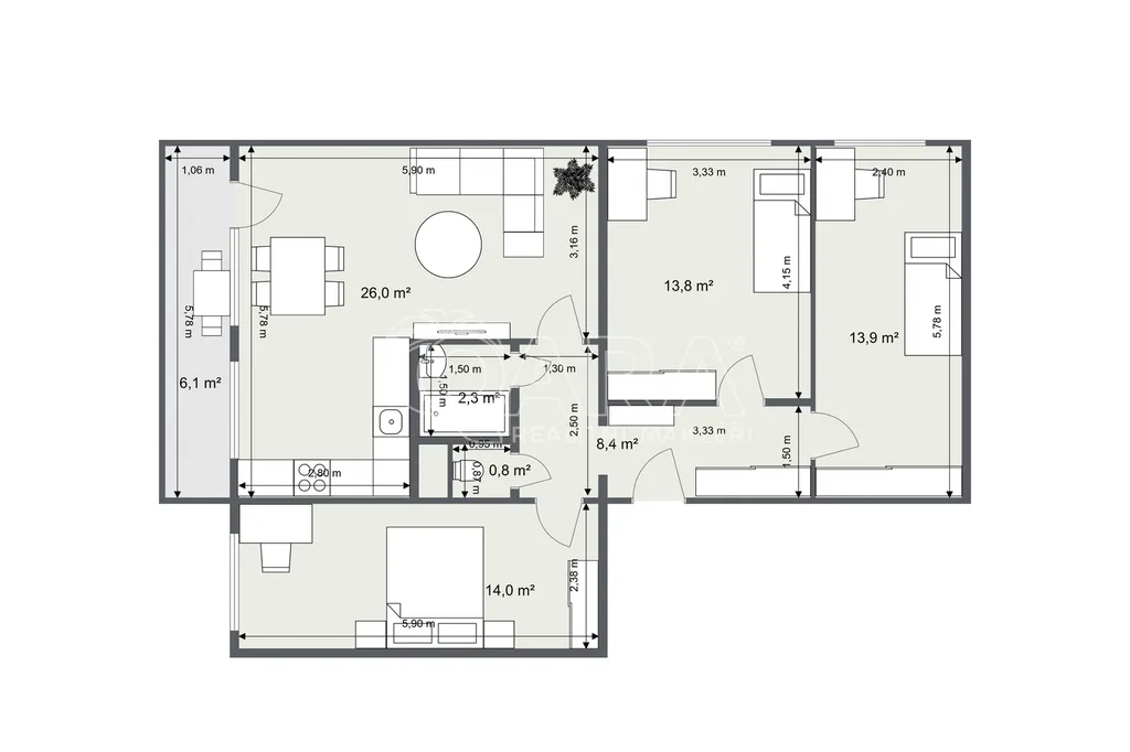 Dominantou bytu je světlý obývací pokoj s moderním kuchyňským koutem a přímým vstupem na lodžii. Byt dále disponuje třemi samostatnými neprůchozími pokoji o velikosti cca 14 m², které poskytují dostatek soukromí pro každého člena rodiny.