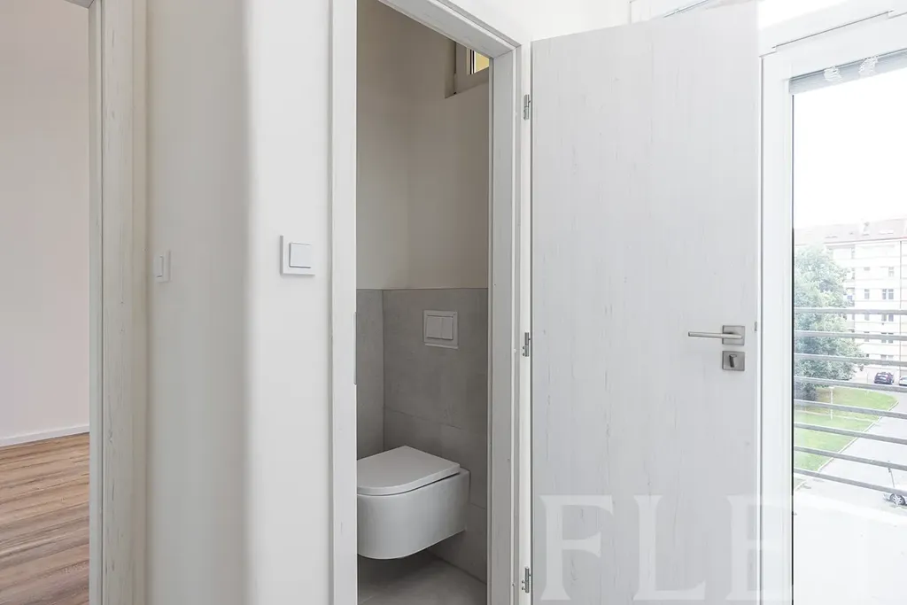 Lodžie (6 m²): Skutečný benefit bytu. Je dostatečně prostorná pro venkovní posezení, kde si můžete vychutnat kávu s výhledem do zeleně.