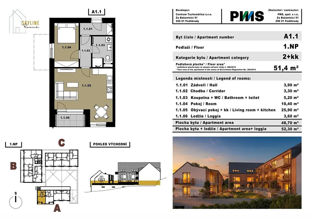 Byt o dispozici 2+kk, označený jako jednotka A.1.1, se nachází v 1. nadzemním podlaží budovy A a nabízí celkovou plochu 52,3 m² včetně prostorné lodžie.
