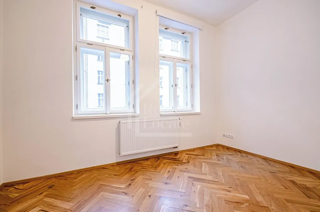 Celková podlahová plocha bytu činí 81,8 m², k jednotce náleží také sklep o velikosti 3 m². Dispozice je prakticky řešena jako obývací pokoj s kuchyňským koutem, dvě samostatné ložnice, koupelna, oddělená toaleta a velkorysá vstupní hala. Interiér si zachovává svůj historický charakter díky původním dřevěným špaletovým oknům, parketám a vysokým stropům, které prostoru dodávají vzdušnost a eleganci. Kuchyňská linka je vybavena vestavěnými spotřebiči, bezpečnostní vstupní dveře zajišťují klid a komfort a v domě je k dispozici moderní prosklený výtah.