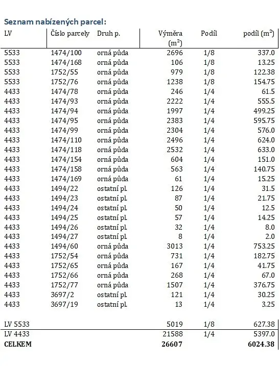 • LV 4433 k.ú. Břeclav – výměra 21 588 m², podíl 1/4 = 5 397 m²