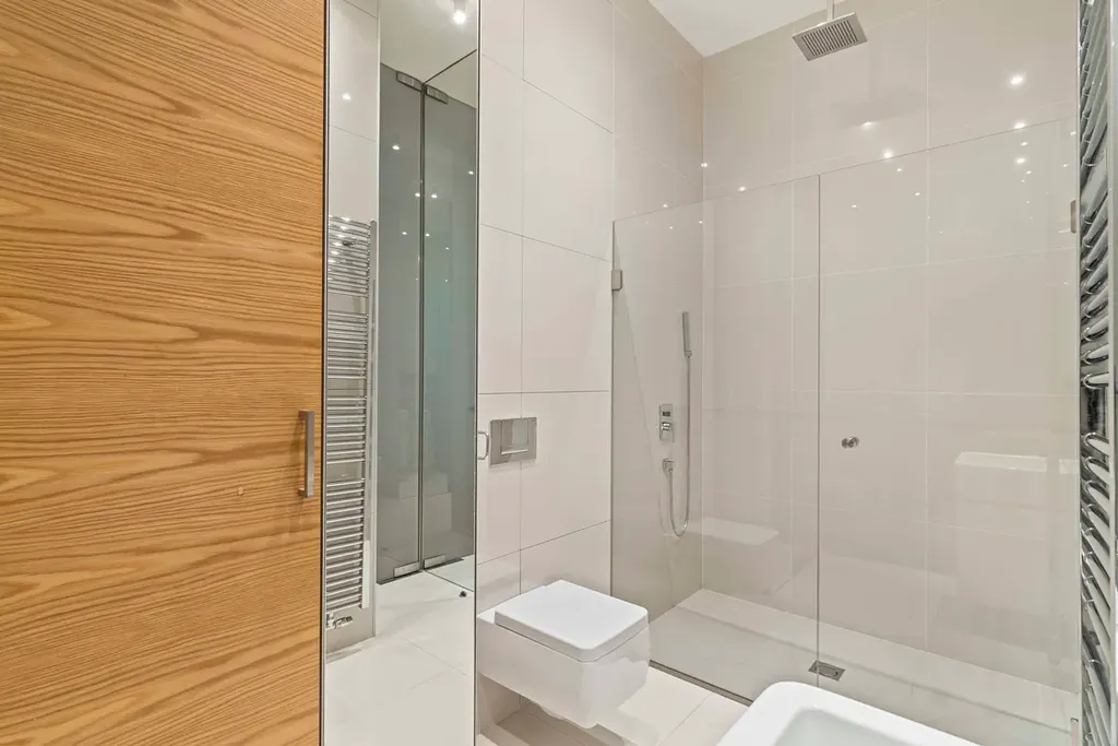 Hlavní část bytu představuje prostorný obývací pokoj s kuchyňskou linkou s vestavěnými spotřebiči v nadčasovém provedení. Dispozice dále zahrnuje dvě ložnice, koupelnu s vanou a toaletou a druhou koupelnu se sprchovým koutem a toaletou. Praktické uspořádání poskytuje komfortní zázemí pro každodenní život.