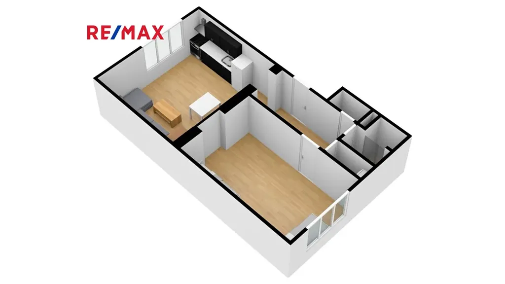 Byt je členěn na obývací kuchyň (cca 24m²), pokoj (cca 18m²), předsíň (cca 7m²), koupelnu (cca 3m²), toaletu (1m²) a komoru (cca 0,98m²).