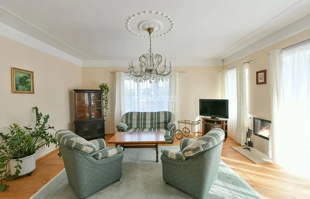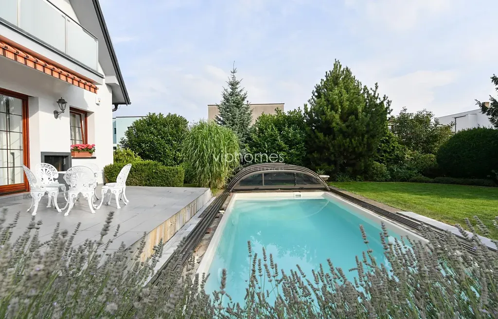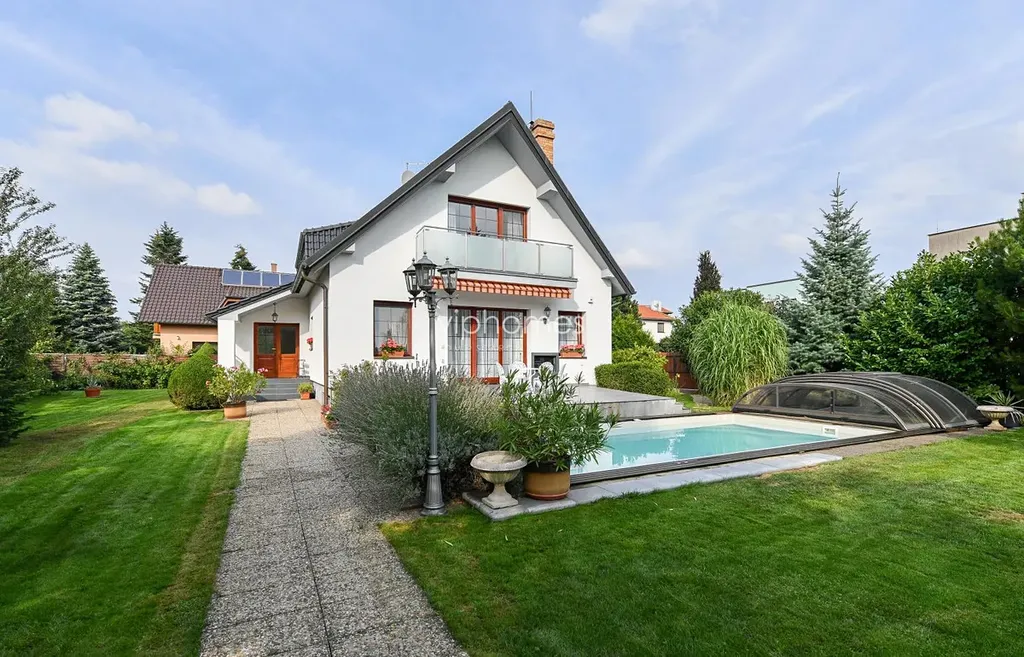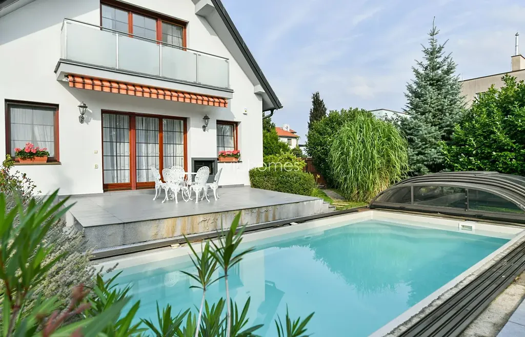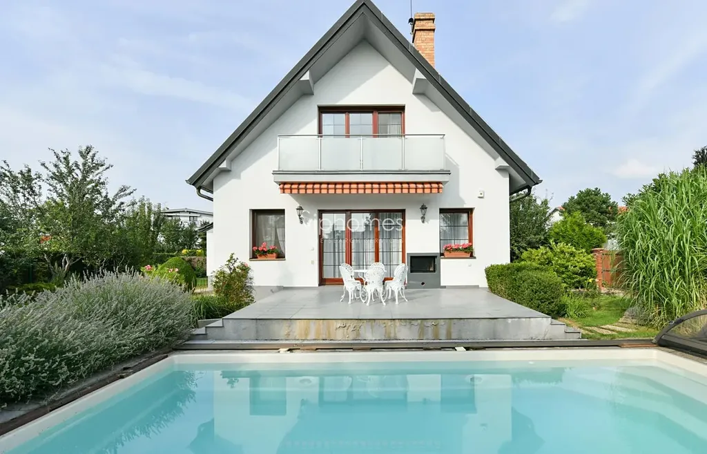 Stylově zařízený dům nabízí 6 ložnic a 2 koupelny. Vnitřní dispozici tvoří formální vstupní hala, obývací pokoj s krbem, plně vybavena kuchyň s jídelním koutem a vstupem na terasu s bazénem, dvě ložnice, koupelna (vana, toaleta, bidet, masážní sprcha), prádelna a samostatná toaleta. V patře je společenský pokoj / herna pro děti, dvě ložnice, pracovní kout, koupelna (sprchový kout a toaleta) a dva balkóny. Prostorný suterén s dostatkem úložných prostor, sociální zařízení ( toaleta / sprcha ). Největším benefitem domu je půvabná zahrada, která obklopuje dům. Relaxační zóna s bazénem a terasou pro posezení s rodinou a přáteli. Garáž pro dva vozy.