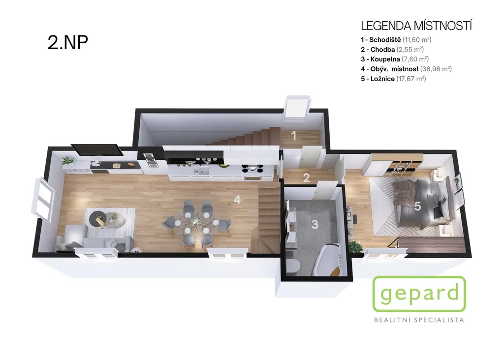 Stavba je rozdělena na dvě plnohodnotné a provozně oddělené bytové jednotky. V prvním nadzemním podlaží se nachází bytová jednotka o dispozici 2+1 s podlahovou plochou 68 m². Ve druhém a třetím nadzemním podlaží je umístěn prostorný mezonetový byt o dispozici 4+kk s výměrou 134 m². Celková užitná plocha činí 201,87 m², zastavěná plocha dosahuje 97,9 m² a celková výměra pozemku je 154 m². Dispoziční řešení umožňuje plnohodnotné soužití více generací pod jednou střechou, případně kombinaci vlastního bydlení a pronájmu.