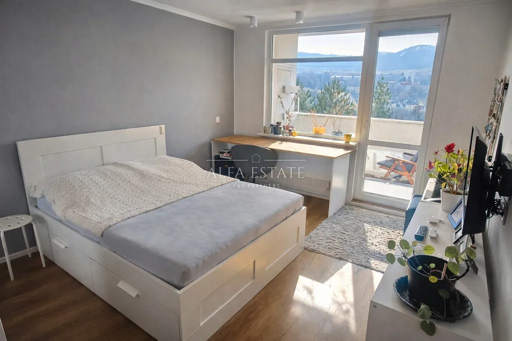 Interiér tvoří prostorná vstupní hala s vestavěnými úložnými prvky, elegantní koupelna se sprchovým koutem, designový kuchyňský kout s kuchyňskou linkou na míru značky Gorenje a kvalitními spotřebiči, plynule propojený s jídelní částí a světlým obývacím prostorem. Za obývacím pokojem se nachází klidová ložnice. Na opačné straně bytu je umístěna druhá prostorná ložnice s přímým vstupem na lodžii, odkud se otevírá úchvatný výhled na Karlovy Vary — ideální místo pro ranní kávu i večerní relaxaci.