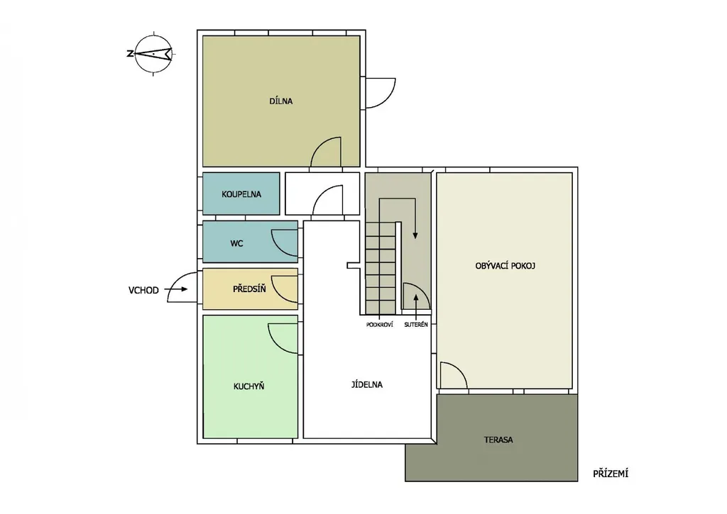 Přízemí: zádveří, velký obývací pokoj se vstupem na terasu, kuchyně, jídelna, koupelna s WC, dílna dříve užívaná jako garáž.