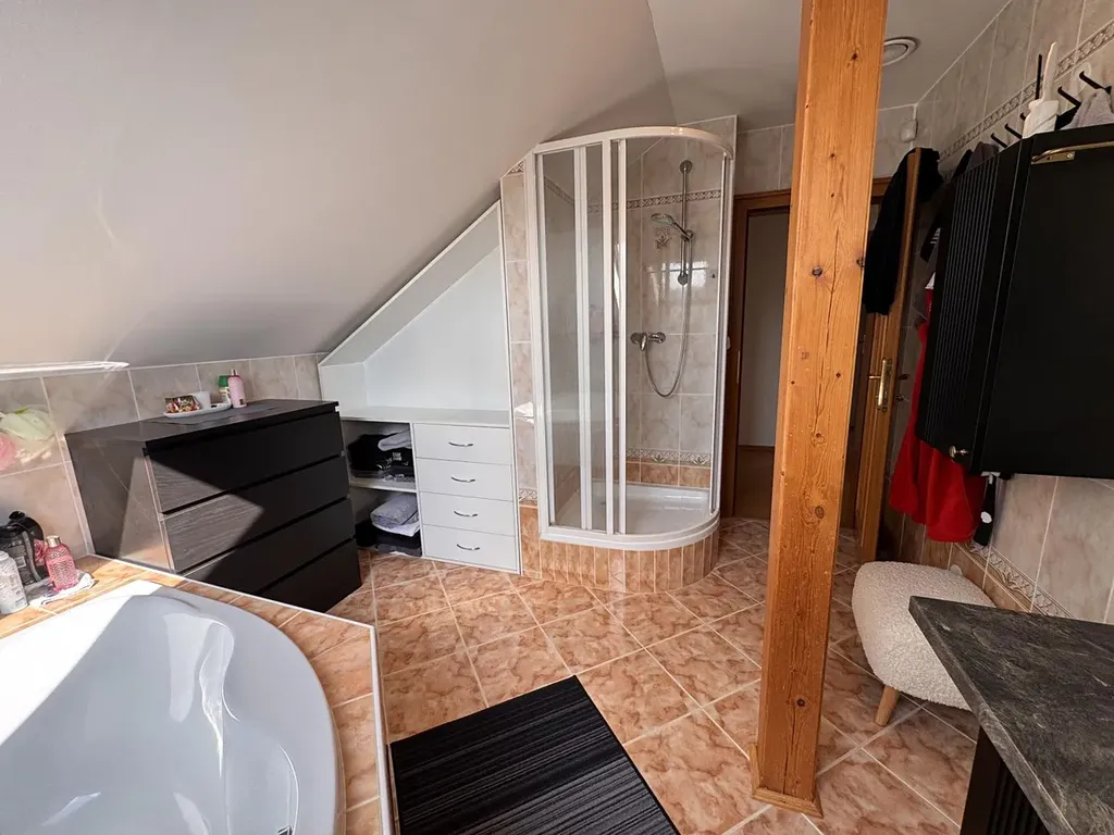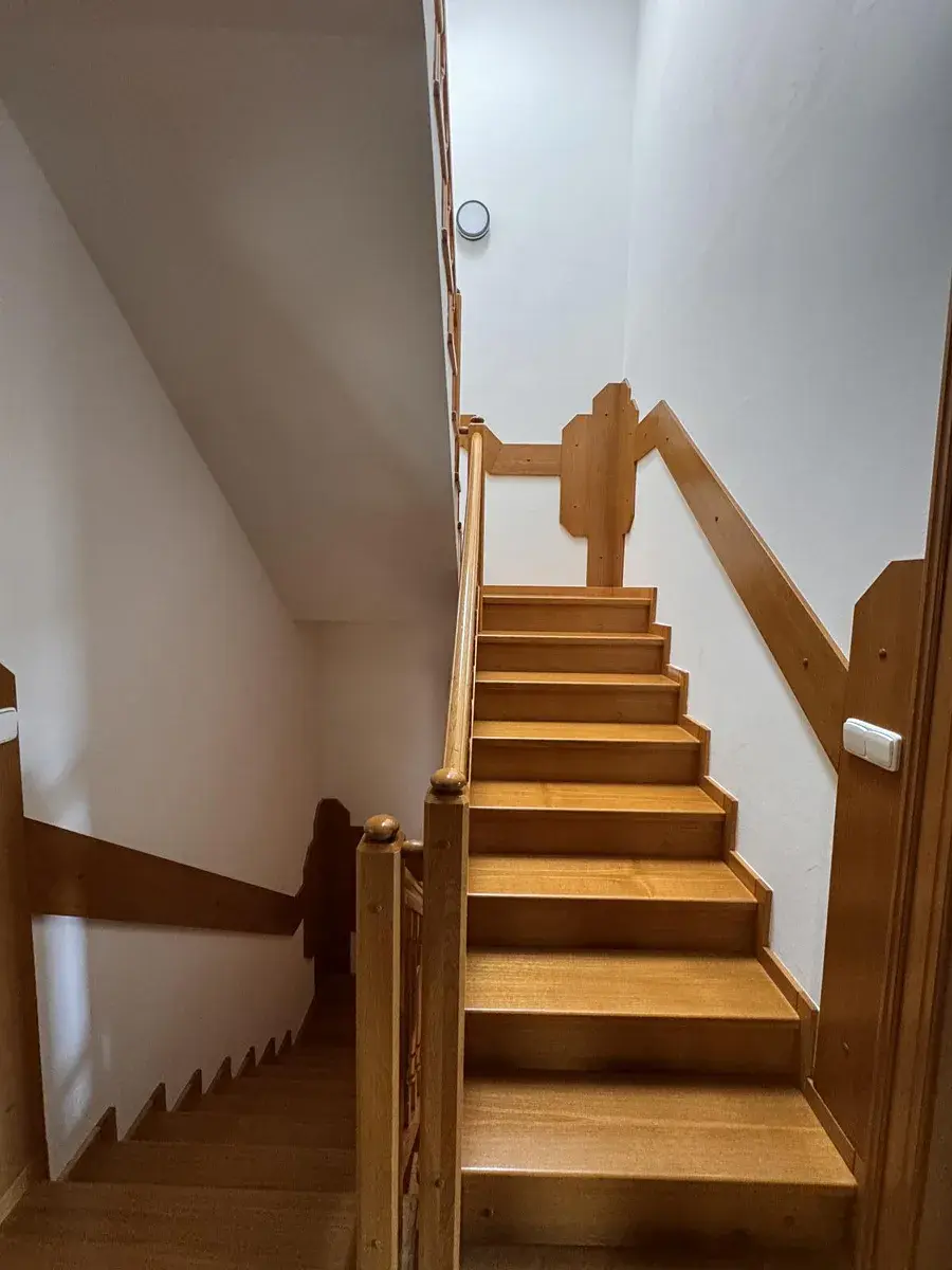 V patře jsou k dispozici čtyři velkorysé pokoje, ideální jako ložnice, dětské pokoje či pracovna, doplněné o koupelnu a samostatné WC.