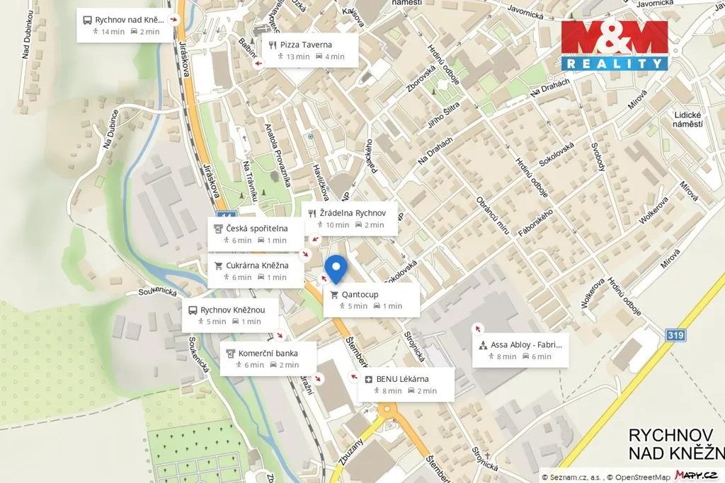 Pronájem obchodních prostor o velikosti 45 m² v centru Rychnova nad Kněžnou. Jedná se o dobře situovaně viditelné prostory směrem do centra města. Jedna světlá místnost v cihlové budově, 1. nadzemní podlaží, součástí je také menší kuchyňka. Po domluvě je možnost pronajmout i atrium v budově. Výhodná centrální poloha s dobrou dostupností. Prohlídky po dohodě. informujte se u makléře.