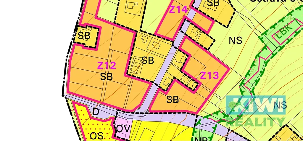 komunikace. Dle územního plánu je možná výstavba rodinného domu (SB - plocha smíšená obytná, Z12).