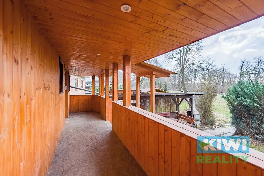 Před vstupem do chaty vás přivítá prostorná nově vybudovaná terasa, která se táhne podél celé přední části stavby. Nabízí dostatek místa pro posezení s rodinou či přáteli a na jejím konci se nachází prakticky řešený WC koutek.