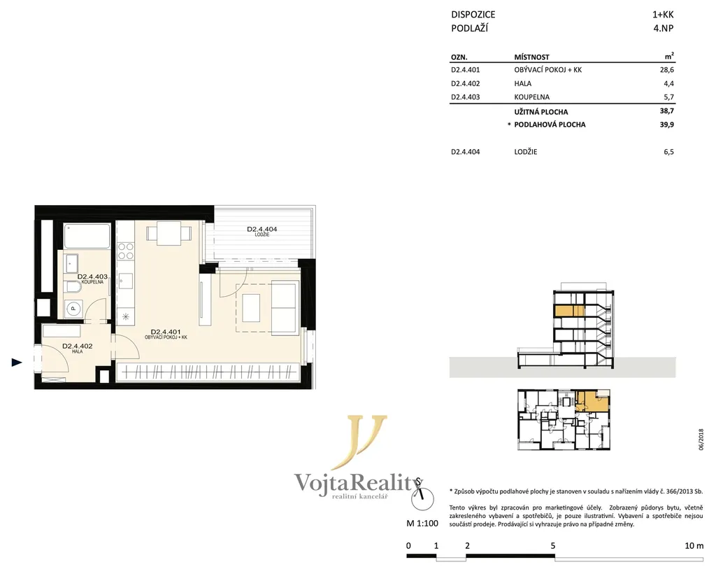 Byt se skládá ze vstupní chodby, obývacího pokoje propojeného s kuchyní, koupelny s WC a sklepa. Z obývacího pokoje vede vstup do lodžie. Byt je orientovaný na severovýchod.