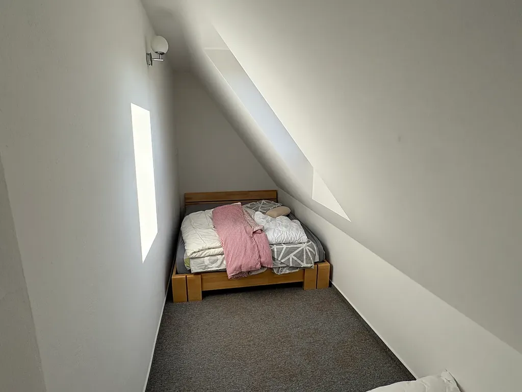V patře jsou dvě ložnice, kdy nyní jedna slouží jako pracovna s navazující šatnou. V patře je též koupelna a WC. Tyto dispozice zajišťují komfortní bydlení pro rodinu.