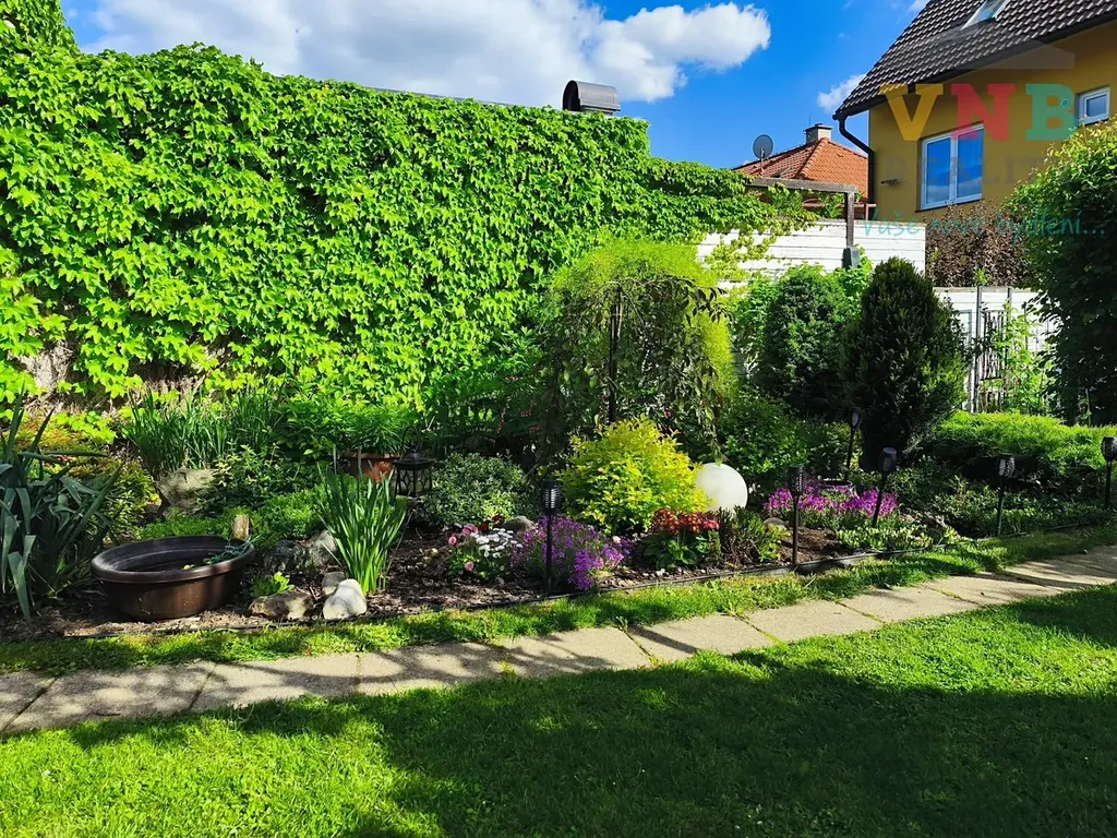 Zahrada je rozdělena na vydlážděnou část, kde je možné umístit zahradní houpačku, solární sprchu, bazén, vyvýšené záhony, dále zatravněnou část s ovocnými stromy a okrasnou zahradou a prostor s dřevěnou pergolou s domečkem na nářadí, průchozí na vedlejší obecní přístupovou cestu.