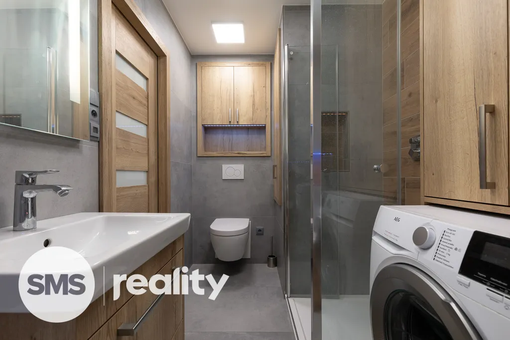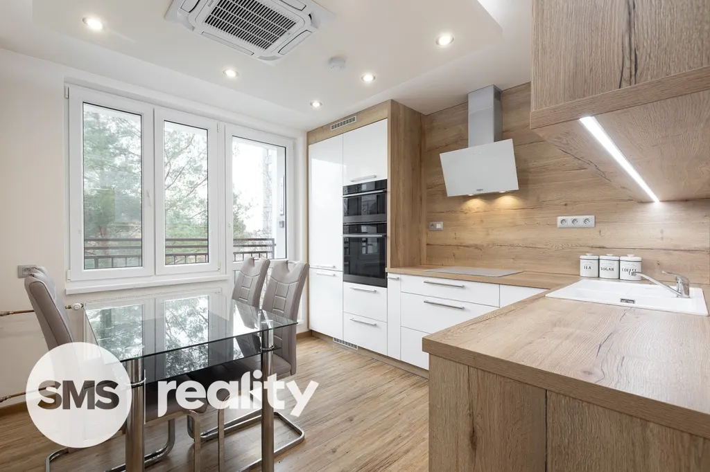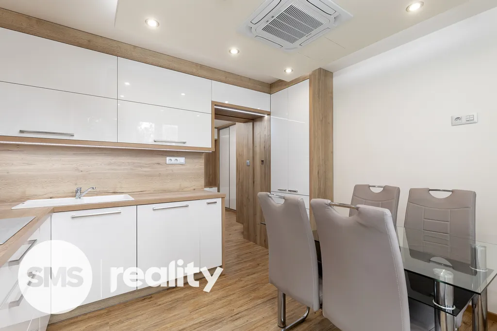 Nově nabízíme byt v družstevním vlastnictví, který se nachází ve 4. nadzemním podlaží panelového domu na ulici Petruškova v Ostravě - Zábřehu. Celková plocha bytu včetně balkónu a sklepní kóje činí 70,4m2. Byt prošel před rokem nákladnou rekonstrukcí – sádrokartonové podhledy s osvětlením, vinylové podlahy, klimatizace, kuchyně na míru, kvalitní spotřebiče (indukční deska, el. trouba, mikrovlnná trouba, myčka, digestoř, granitový dřez), bezpečnostní dveře a praktické vestavěné úložné prostory. Koupelna je vybavena bezbariérovým sprchovým koutem, ale také vanou. Součástí je také umyvadlo se zrcadlem a skříňkou, prostor na pračku a sušičku. Klidnou atmosféru doplní LED osvětlení. Z prostorné chodby je přímý vstup do dětského a obývacího pokoje s dalšími úložnými prostory. Ložnice je situována v zadní části bytu. Balkón nabízí příjemný výhled do zeleně, je zde také připraveno připojení pro elektrický gril.