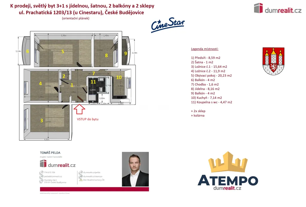 Dumrealit.cz Vám zprostředkuje prodej světlého, prostorného a částečně zrekonstruovaného bytu 3+1 s jídelnou, šatnou, 2 balkóny a 2 sklepy, v osobním vlastnictví na adrese Prachatická 13/1203 (u multikina Cinestar) ve městě České Budějovice. Bytová jednotka se nachází v 6. podlaží zatepleného panelového domu s výtahem a dvěma sklepy, přičemž jeden ze sklepů se nachází přímo na patře. Byt je situovaný na severovýchodní a jihozápadní světovou stranu. Měsíční náklady na provoz bytu pro 4 osoby činí 4.861,- Kč (fond oprav, vodné, stočné, vytápění, el. energie atd.) + elektřina a internet. Veškerá občanská vybavenost (školka, škola, praktický lékař, obchody, pošta, MHD) je v místě bydliště. Podrobné rozkreslení dispozice naleznete na orientačním plánku mezi fotografiemi. Bytovou jednotku lze přestavět na 4+1. Byt je připraven k okamžitému nastěhování. Zajistíme Vám financování a veškerý právní servis. Více informací Vám poskytne realitní makléř Tomáš Pelda z realitní kanceláře A TEMPO fungující pod ochranou známkou dumrealit.cz. Ev. číslo: 655127.
