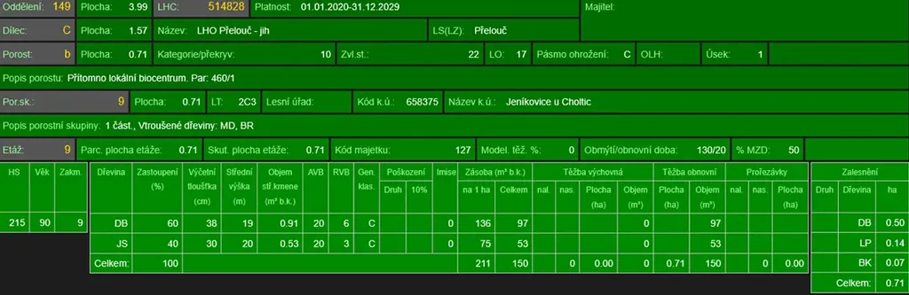 - p.č. 460/1 vedená jako lesní pozemek o celkové výměře 7 107 m2 (stáří lesa 95 let - zastoupení dřevin dub, jasan)