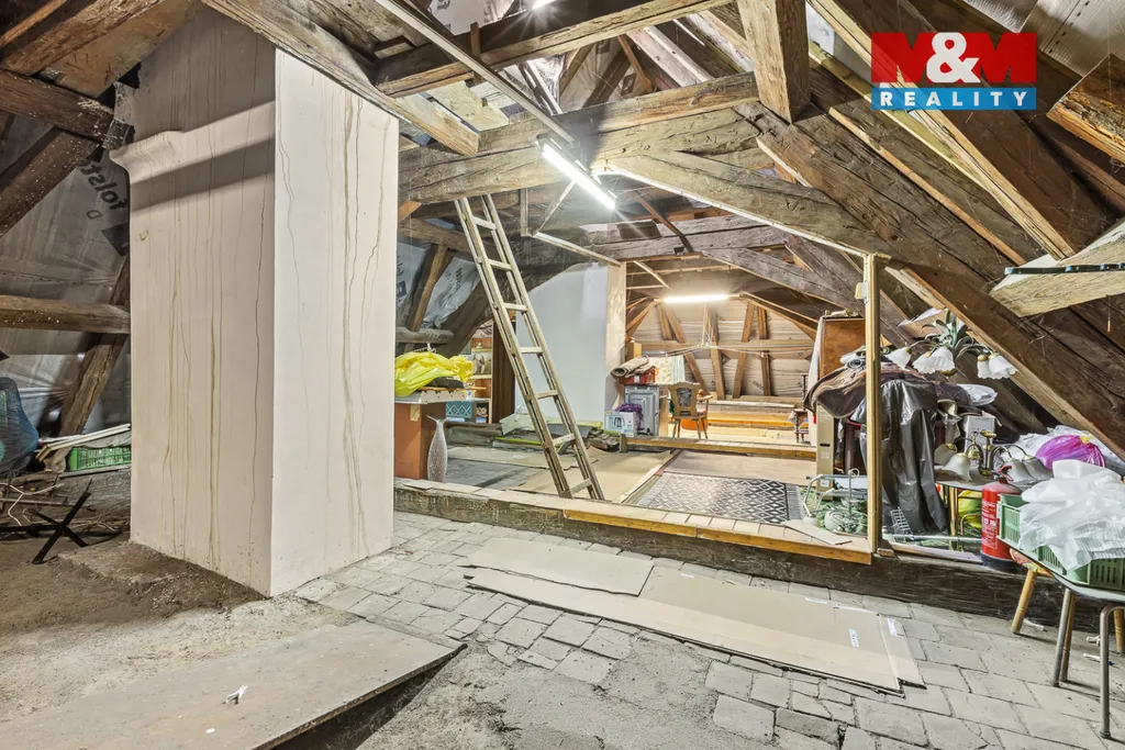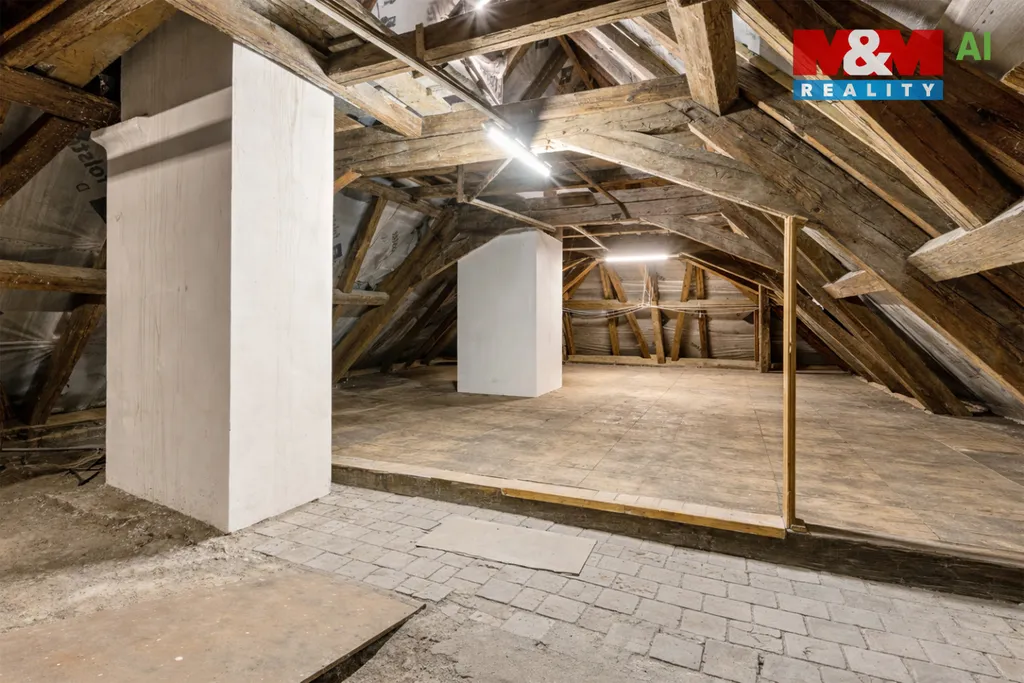 Na půdu vystoupáme po pohodlném schodišti a ta nás pak překvapí také svou velikostí a výškou. Pokud byste případně chtěli obytnou plochu i tady, pak je tu spousta možností.