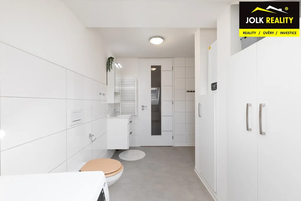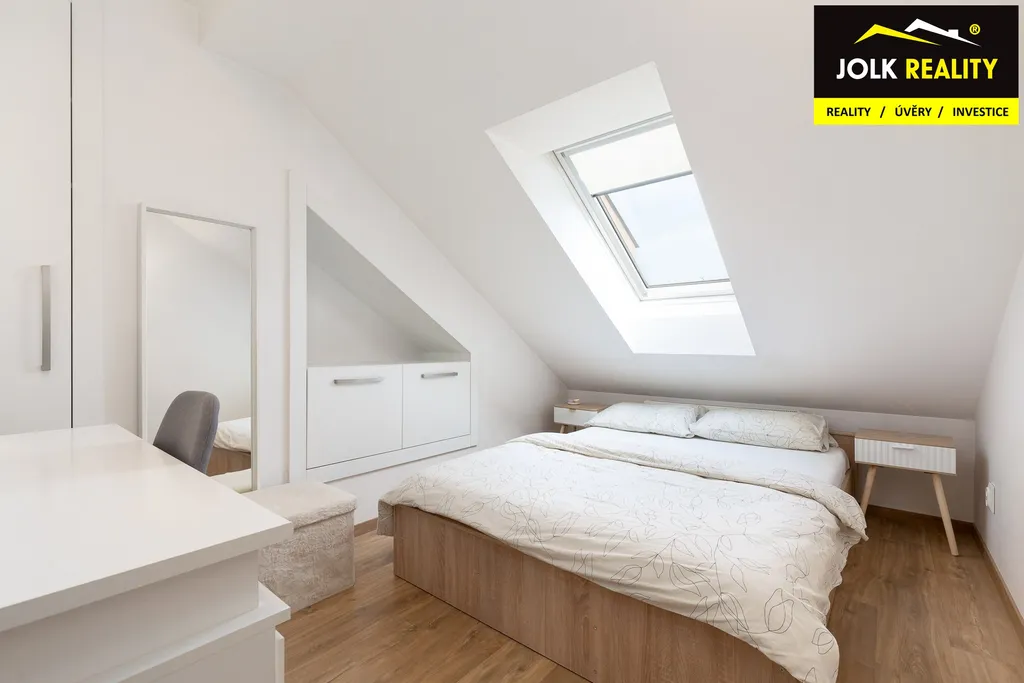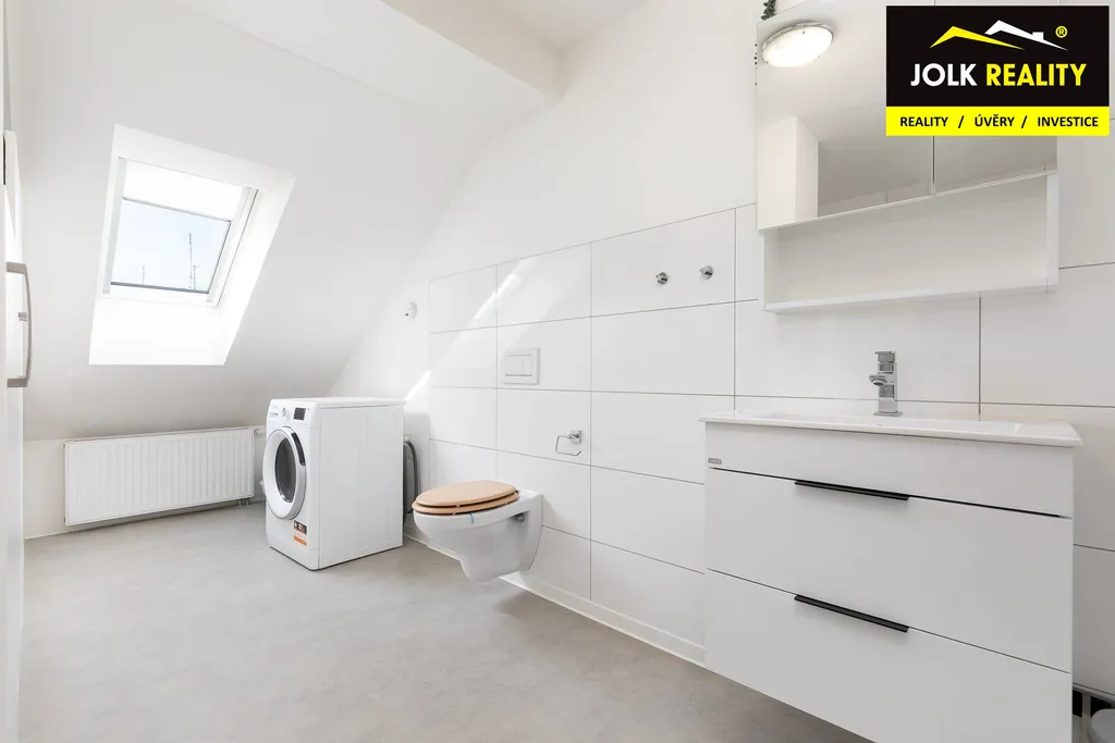 Atraktivní vestavba s kuchyňskou linkou a vestavěnými skříněmi na míru jde ruku v ruce s elegantním a kvalitním technickým zázemím. Mám na mysli plynový kondenzační kotel BAXI + saulus termostat, klimatizační jednotku Sinclair, střešní okna Velux s trojsklem + zatemňovací roletky, laminátovou podlahu Quick step a dveře s obložkami firmy Zlomek, za vestavěné spotřebiče lednička s odděleným mrazákem Bosch, myčka 45 Whirpool, granitový dřez a digestoř s odtahem.