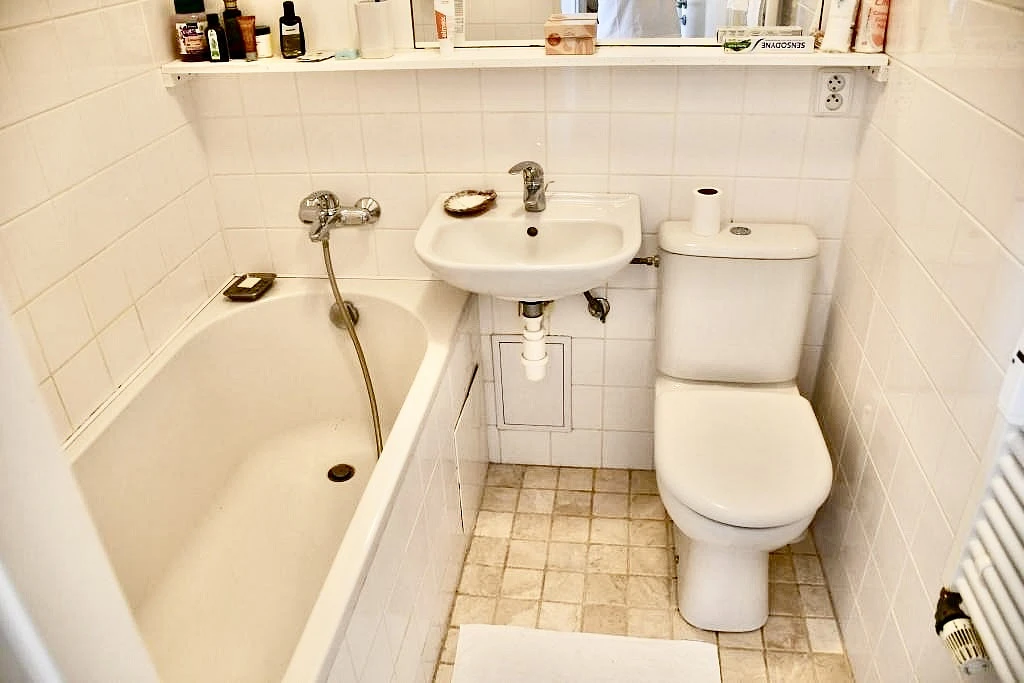 V koupelně je umístěna vana, umyvadlo, toaleta, zrcadlo.