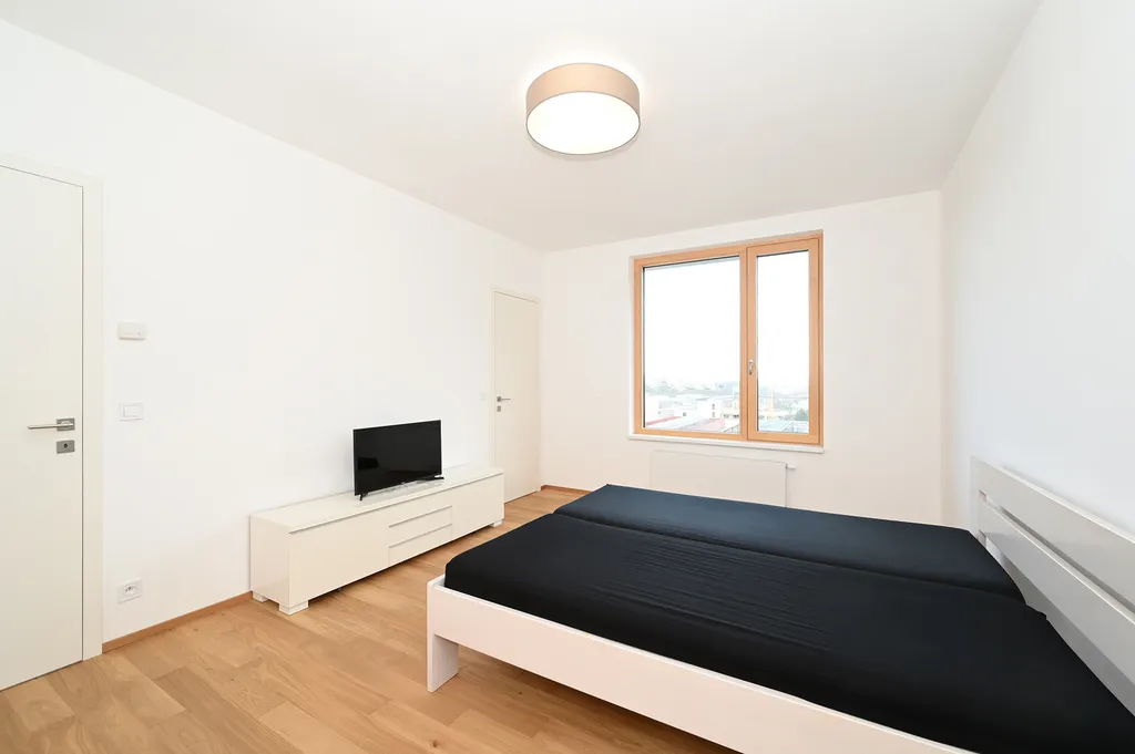 Dominantou bytu je prostorný obývací pokoj s moderní kuchyňskou linkou v elegantním černém matném provedení, která je kompletně vybavena vestavěnými spotřebiči značky Bosch, konkrétně elektrickou troubou, sklokeramickou varnou deskou, myčkou, lednicí s mrazákem a digestoří. Celý prostor působí velmi čistě a nadčasově a díky velkým oknům je přirozeně prosvětlený po celý den. Z obývací části je přímý vstup na lodžii, která nabízí příjemné místo pro ranní kávu nebo večerní relax s výhledem.