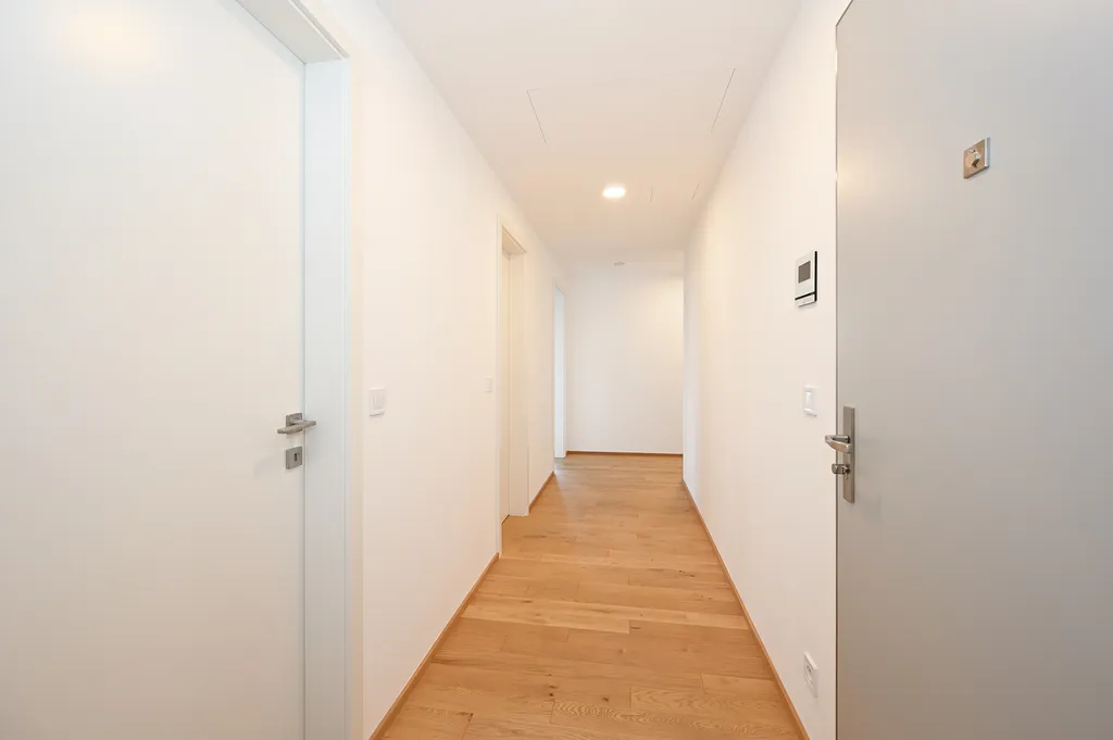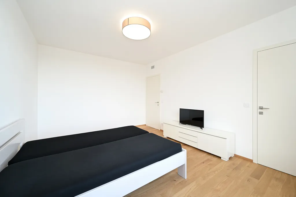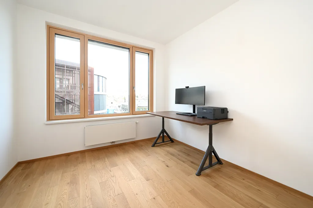 Součástí bytu je také praktická komora, ve které je k dispozici pračka a sušička značky Bosch. V celém bytě jsou kvalitní dřevěné podlahy a elektrické předokenní žaluzie, které umožňují regulaci světla i soukromí. Samozřejmostí je také rekuperace vzduchu, která přispívá ke zdravému a úspornému provozu domácnosti.