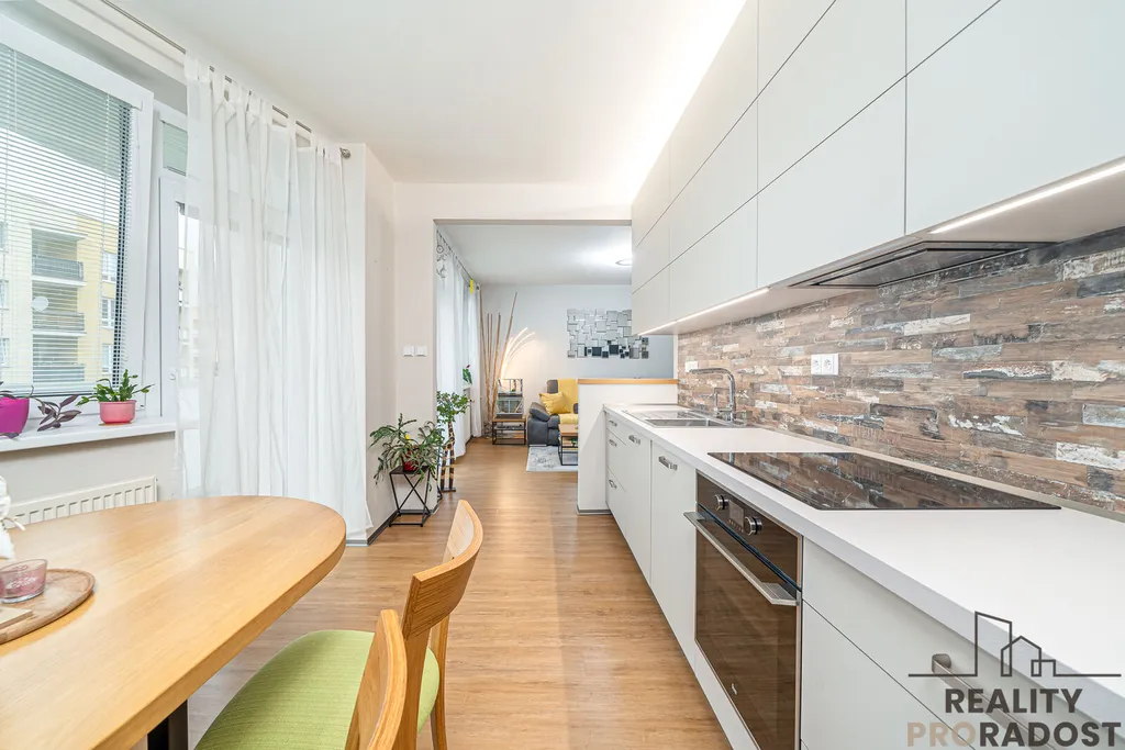 Byt je velmi hezky řešený, obývací pokoj tvoří středovou část bytu se vstupem do kuchyně, na balkon a do dalších dvou pokojů. Byt je moderně zrekonstruovaný se spoustou úložného prostoru ve vestavných skříních, šatně, komoře a spíži. Další úložný prostor nabízí sklep v suterénu. K bytu je možné pronajmout 1- 2 garážové stání.