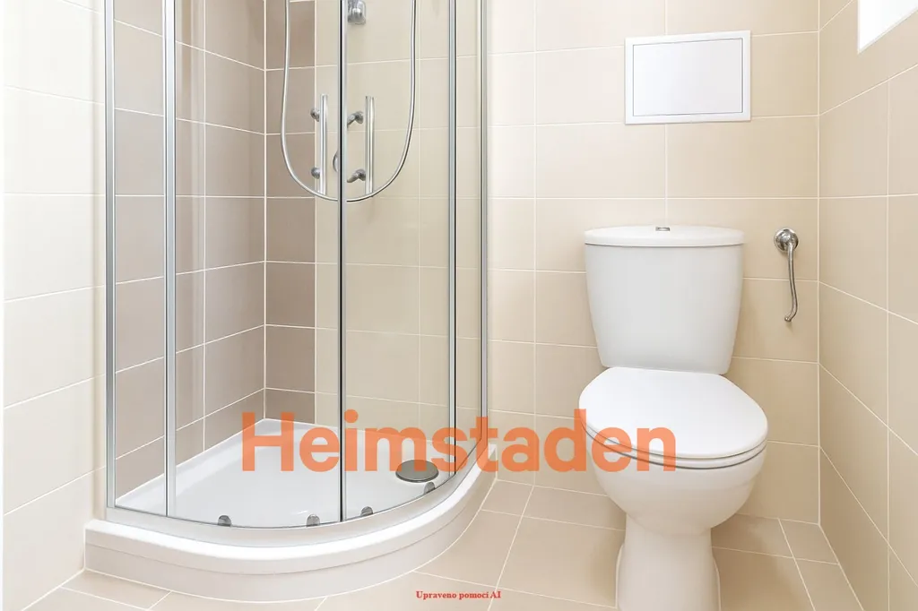 Koupelna je řešena v příjemných hnědo-béžových tónech a nabízí sprchový kout i toaletu v jednom prostoru.