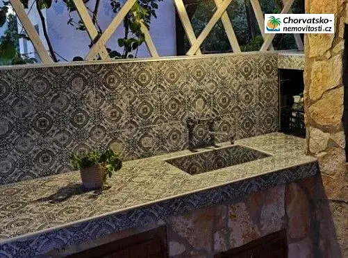 Krytá terasa s letní kuchyní, kamenným grilem a prostorem pro socializaci a relaxaci.