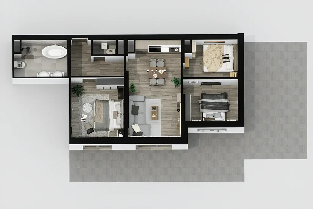 Díky výměře 82m2 splní tento byt všechna naše očekávání: koupelna s vanou a sprch. koutem o výměře 8m2, prostorné pokoje a především nádherná terasa.