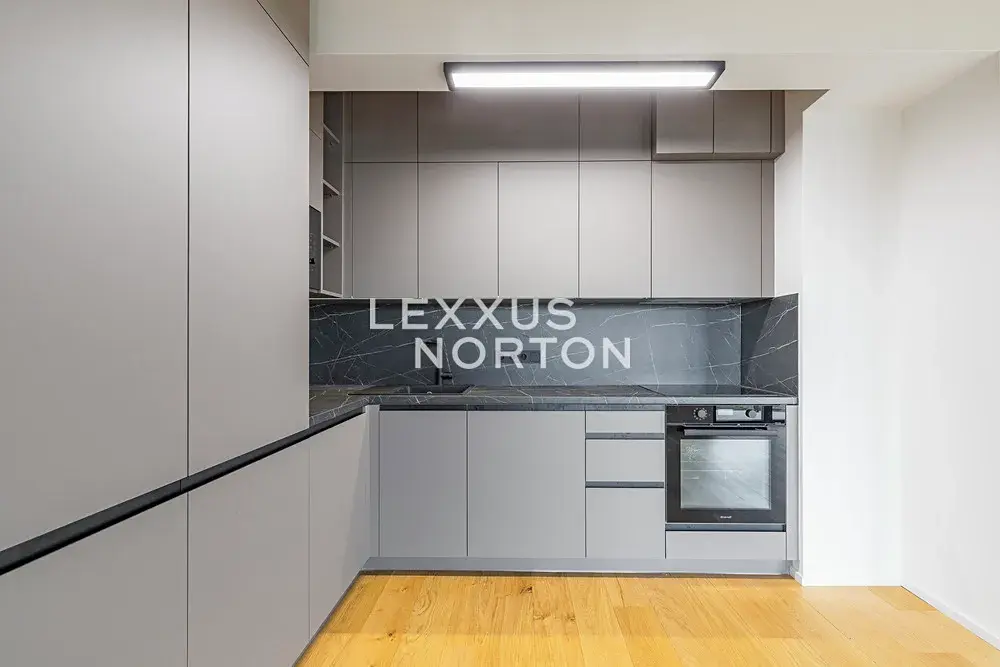 Kuchyňský kout je vybavený indukční varnou deskou, troubou, lednicí s mrazákem, mikrovlnnou troubou, myčkou nádobí a pračkou. Vstupní chodba a ložnice disponují vestavěnou skříní. Byt dále disponuje moderním smart home systémem Loxone, který umožňuje mimo jiné inteligentní ovládání venkovních žaluzií, regulaci podlahového vytápění a chlazení v každé místnosti či monitorování spotřeby vody a energie.