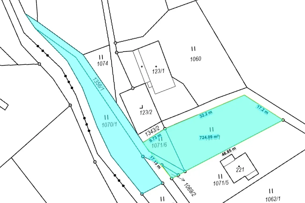 Pozemek se rozprostírá po stranách celoročně udržované veřejné komunikace. Jedna část o velikosti cca 715 m2 je ideální např. pro stavbu domu, chaty, chalupy a druhá ležící podél potoka, může být využívána například na parkování aut, či skladování dřeva.