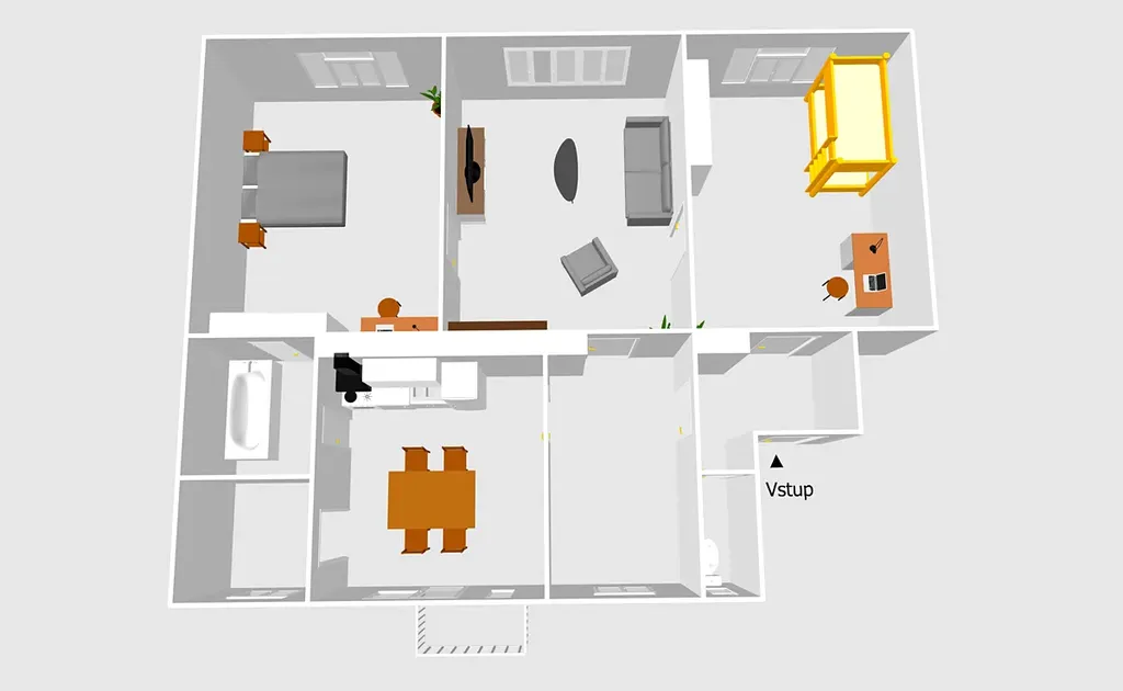 Byt zaujme velkorysým prostorem a praktickou dispozicí. Dominantou jsou prostorné, světlé pokoje s vysokými stropy a dostatkem přirozeného světla, které podtrhují jedinečný charakter bydlení.
