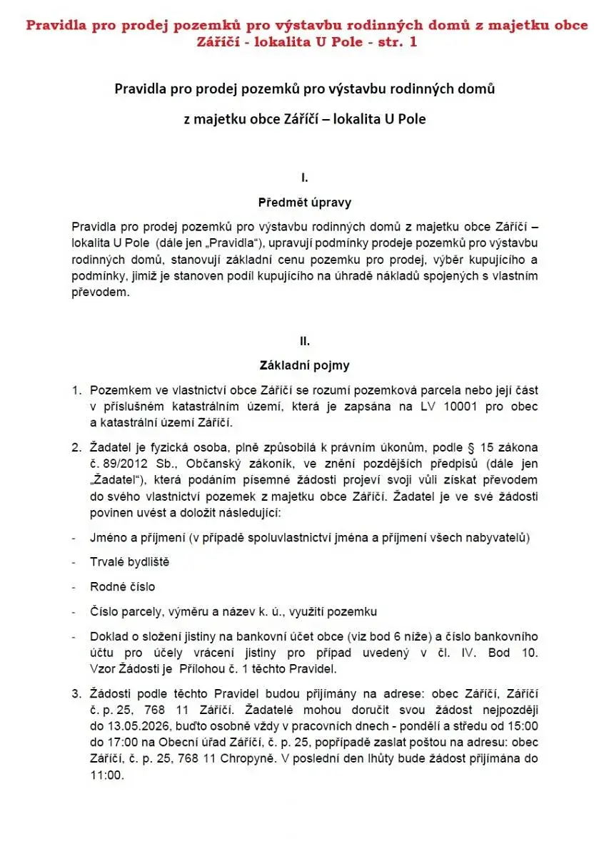 Záměr prodeje pozemků - Obec Záříčí