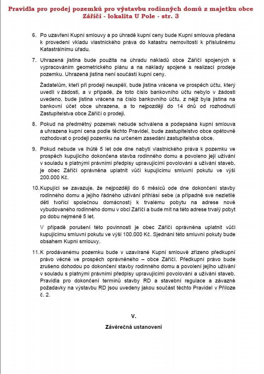 Podmínkou pro výstavbu je dodržení stavební čáry - 6m podél komunikaceod hranice stavebního pozemku. Maximální zastavitelná plocha je RD je stanovena na 200 m2. Garážování a parkování je nutno zajisit v rámci vlastních pozemků, a to v minimálním rozsahu 1 odstavné stání a 1 parkovací stání. Oplocení bude umístěno v uličním prostoru na hranici stavebního pozemku a veřejného prostranství výšky max. 1,5 m, min. ze 2/3 transparentní. Oplocení nesmí svým rozsahem, tvarem a použitým materiálem narušit charakter stavby na oplocovaném pozemku a jeho okolí.