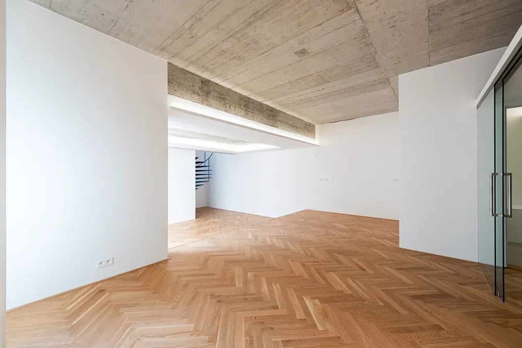 Byt se nachází ve 2. nadzemním podlaží a tento prostor má zcela jedinečnou atmosféru – její podstatu určuje beton, vnímaný zde jako ušlechtilý materiál a geniální vynález litého umělého kamene. Celý proces jeho zpracování byl ponechán v maximální autenticitě. Záměrně bylo použito již jednou využité dřevěné bednění, které nese stopy práce řemeslníků a vytváří přirozeně živou, neuhlazenou strukturu. Výsledný povrch působí naturálně a opravdově, podobně jako při rekonstrukcích, kdy se na světlo znovu dostávají skrytá tajemství minulosti.