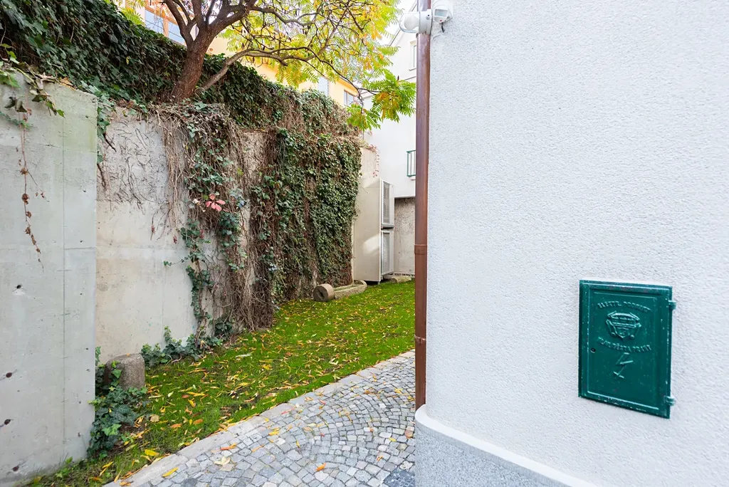 Tento přístup vychází ze spolupráce architekta Jiřího Huška se švýcarským architektem Christianem Kerezem. Beton zde zároveň odkazuje na broušené teracové podlahy i opěrnou stěnu dvora, s nimiž tvoří jednotný, harmonický celek oslavující pravdivost a poctivost konstrukce. Součástí bytu je také samostatná garsoniéra s koupelnou (29 m²), ideální pro hosty, au-pair či domácí kancelář. Je orientována do tichého vnitrobloku a poskytuje naprosté soukromí s výhledem do stromořadí a popínavé zeleně. Je to malý svět sám pro sebe – prostor, který přirozeně doplňuje charakter celého bytu.