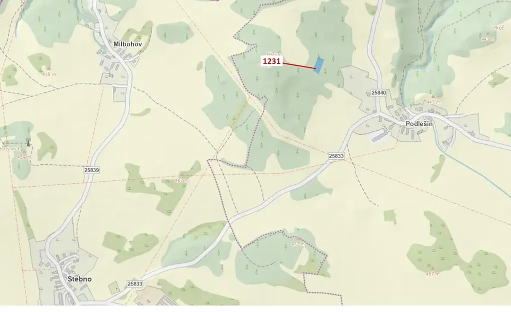 Lesní pozemek o výměře 1462 m2, parcelní číslo 1231, podíl 1/1, katastrální území Podlešín u Stebna, obec Stebno, obec s rozšířenou působností Ústí nad Labem, okres Ústí nad Labem, Ústecký kraj.