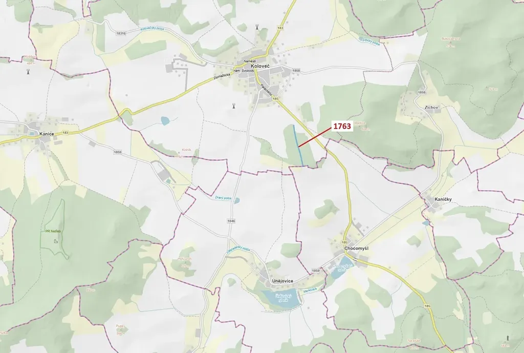 Lesní pozemek o výměře 7329 m2, parcelní číslo 1763, podíl 1/1, katastrální území Koloveč, obec Koloveč, obec s rozšířenou působností Domažlice, okres Domažlice, Plzeňský kraj. Po těžbě.