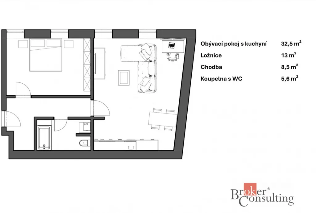 Nabízí prostorný obývací pokoj s kuchyňským koutem, ložnici, chodbu a koupelnu s WC.