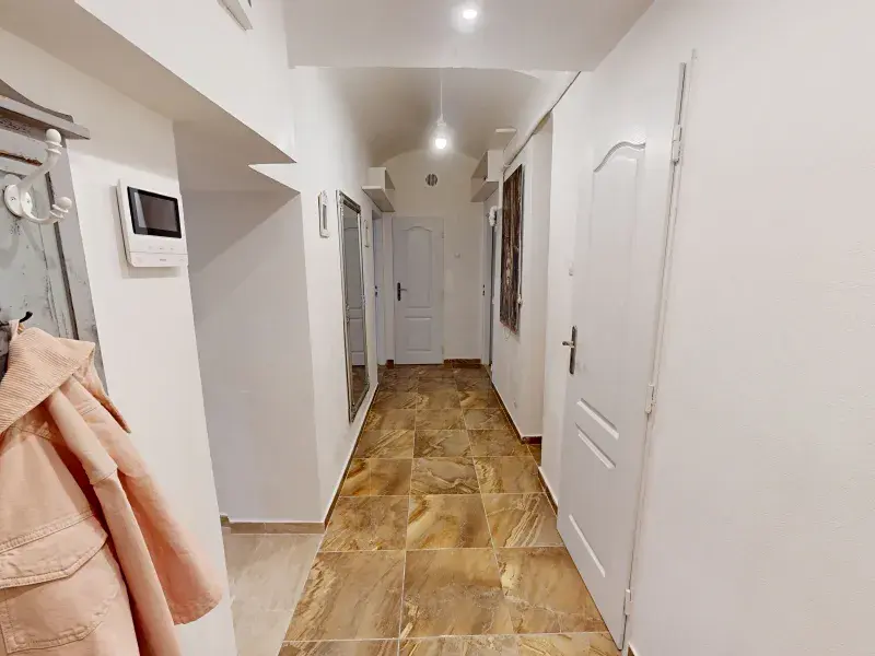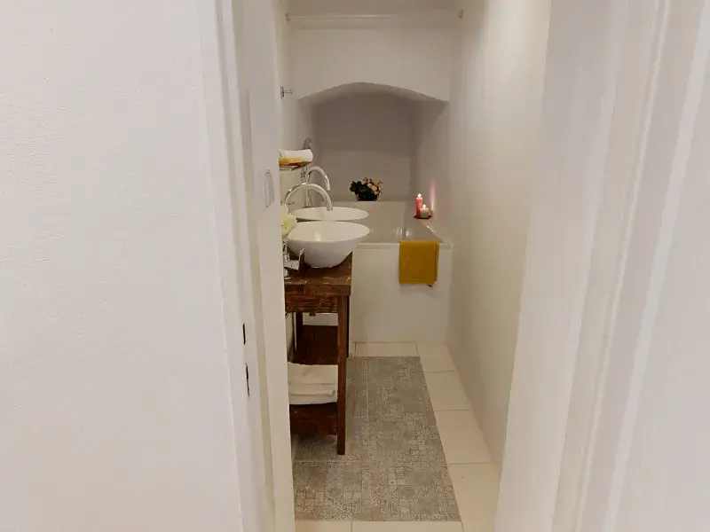 Z chodby vcházíme do velkorysého obývacího prostoru (28 m2) s klenutými stropy, jenž je aktuálně ložnicí s obývací částí, je však možnost jej přepažit a docílit tak dvou samostatných pokojů. Pokračujeme do prostoru s kuchyní a jídelnou (kuchyňská linka s ostrůvkem včetně vestavěných spotřebičů) komunikující se zahradou osvětlenou odpoledním sluncem. Samostatným vstupem z chodby se přesouváme do originálně řešené útulné koupelny, či na samostatné WC. Byt disponuje též praktickou šatnou a úklidovou komorou.