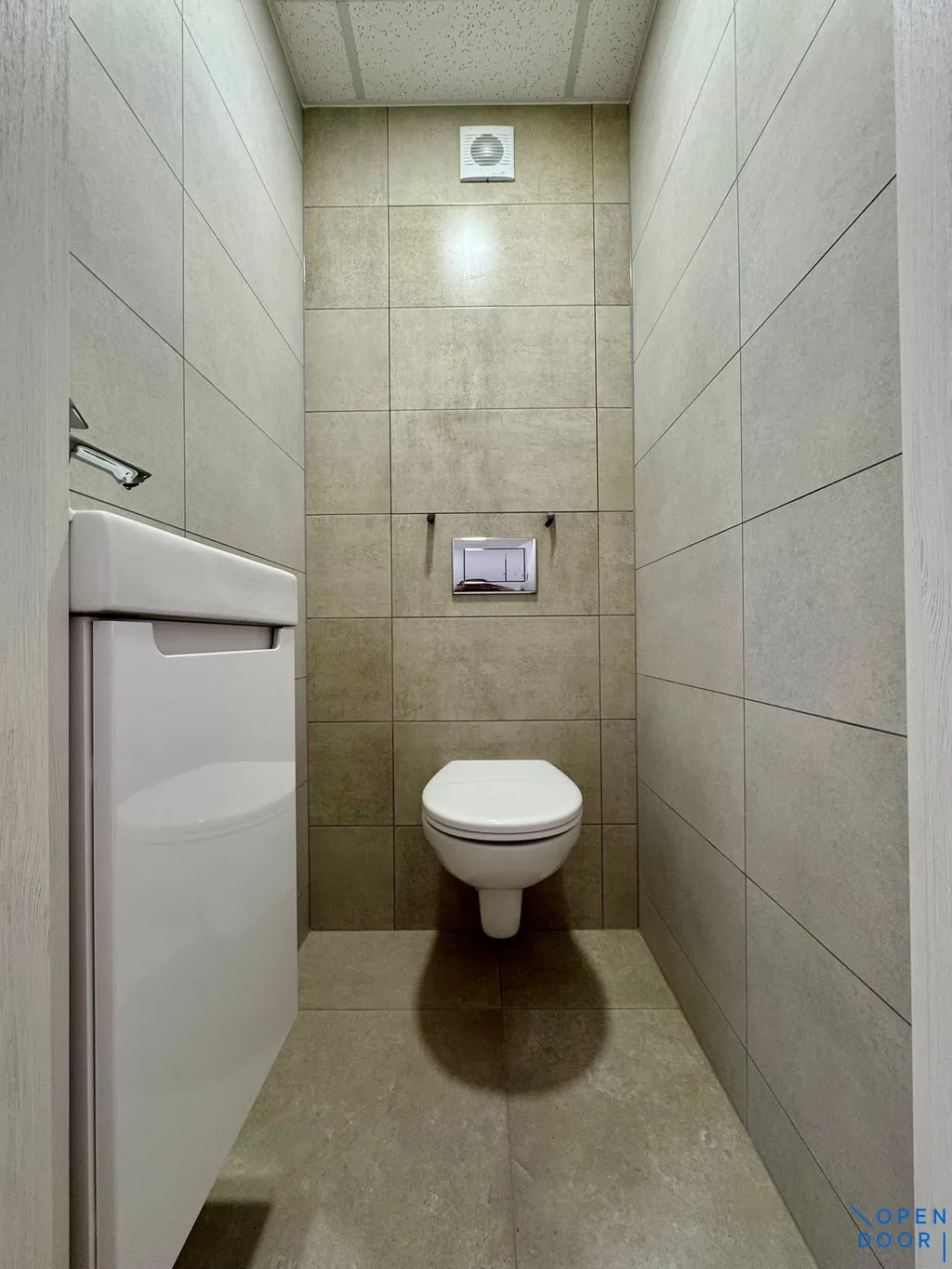 Koupelnové jádro je rozšířené a moderně řešené, vybavené sprchovým koutem, zrcadlem a umyvadlovou skříňkou. Toaleta je samostatná, disponuje závěsným WC, umyvadélkem a praktickou skříňkou.