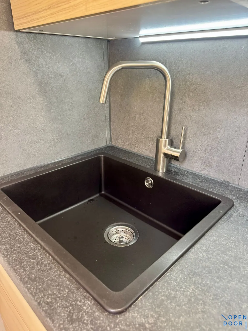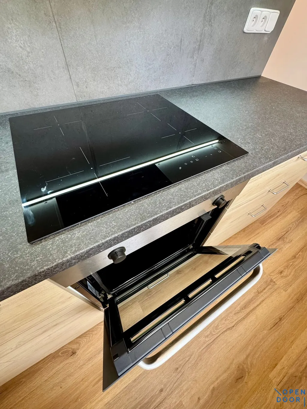 Kuchyňská linka je z IKEA a je vybavena vestavnými spotřebiči – horkovzdušnou troubou, indukční varnou deskou a výsuvnou digestoří.