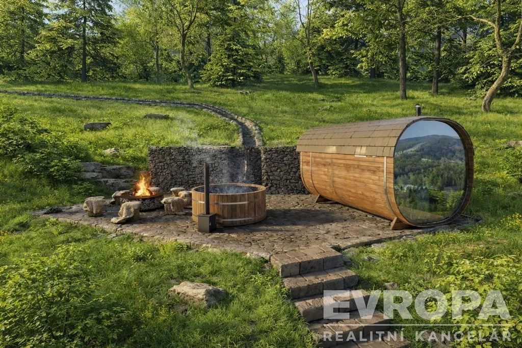 venkovní wellness zónu (sauna, koupací sud s horkou vodou, ohniště),