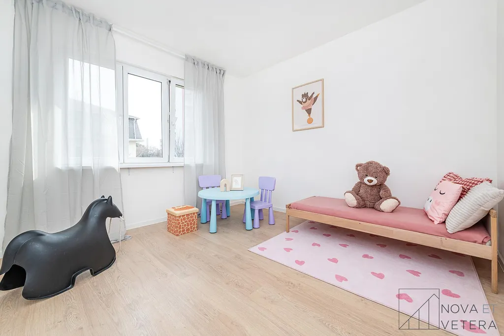 Dispozice bytu nabízí prostorný obývací pokoj s kuchyňským koutem a tři samostatné pokoje, které lze využít jako ložnici, dětský pokoj nebo pracovnu. Dále byt disponuje koupelnou s vanou, samostatnou toaletou, technickou místností, která může sloužit i jako komora a vstupní chodbou s dostatkem místa pro úložné řešení. K bytu náleží také prostorný sklep o velikosti 10 m².