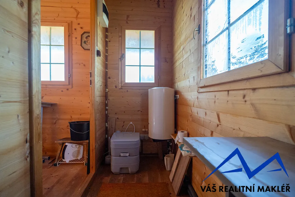 Jedna chata (17 m² ) je používaná k ubytování, vybavená postelemi, koupelnou se sprchovým koutem a suchým WC + venkovní solární sprcha.