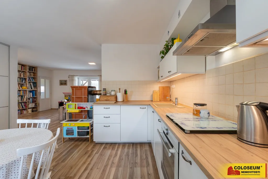 Interiér domu nabízí komfortní bydlení s dostatkem prostoru pro celou rodinu. K dispozici jsou dvě koupelny a dvě samostatné toalety. V přízemí se nachází podlahové vytápění, zatímco ve druhém patře jsou radiátory napojené na plynový kotel. V obývacím pokoji navíc najdete krbová kamna, která dodávají domu příjemnou atmosféru. Dům je vybaven plastovými okny, ve druhém patře s izolační termo fólií, a terasa má osazena kvalitní trojskla.