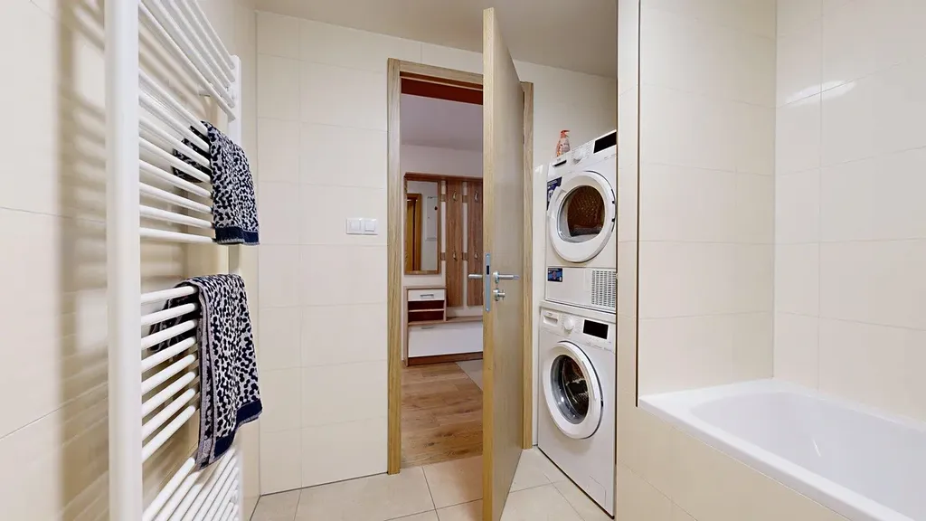 Byt (52,4 m² + sklepní kóje 2,8 m²) se nachází v 2. NP cihlové novostavby. Je vybaven novou kuchyní se spotřebiči (trouba, varná deska, lednice, myčka) a koupelnou s pračkou a sušičkou.
