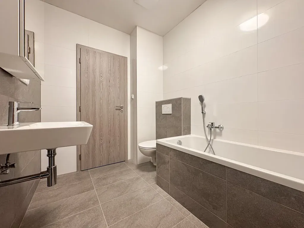 • Koupelna s WC – 6,0 m², moderní provedení, vana, umyvadlo, toaleta, ohřev vody elektrickým bojlerem