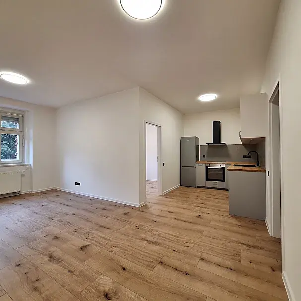 Byt tvoří vstupní chodba a odsud je prostorný obývací pokoj , propojený s kuchyní a výhledem do zahrady. Kuchyně s moderní kuchyňskou linkou je plně vybavena novými spotřebiči: horkovzdušná el. trouba, varná deska, odsavač par, myčka, pračka se sušičkou, kombinovaná chladnička. Dále byt tvoří ložnice orientovaná do vnitrobloku zahrady se vstupem na vlastní předzahrádku. Koupelna se sprchovým koutem a toaletou se nachází se vstupem z chodbičky. Ohřev vody a tepla je centrální. Na podlahách byla použita vinyl a dlažba. K bytu nenáleží sklep.